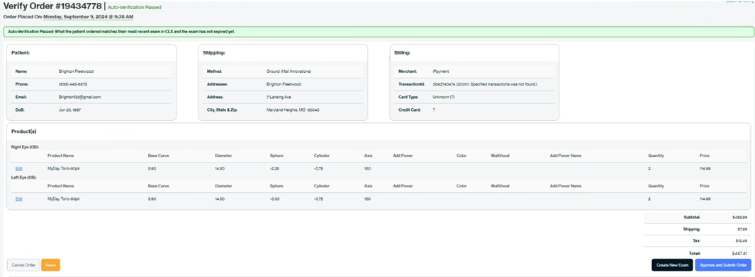 NOTE: If an outside patient placed an order on your webstore, or no exam is entered in CLX for the patient, you will need to click 'Create New Exam' before you can approve and submit the order