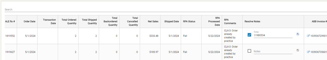 Certain failure codes are the practices’ responsibility to resolve. Once the failure is reviewed and resolved, the practice can view the “Resolve Notes” on the AEGU Report. Click the checkbox, input the Acuity Logic order number, and click the Save button. This will prompt the report to push these orders to “Pass” and will no longer require practice review.